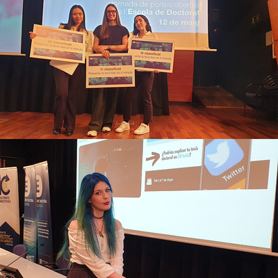 El passat 12 de maig, en el marc de la jornada de portes obertes de l'Escola de Doctorat de la Universitat Politècnica de Catalunya (UPC), s'han lliurat els premis de la final institucional del concurs #HiloTesis 2023, convocat per la Conferència de Rectors de les Universitats Espanyoles (CRUE), i del concurs “Presenta la teva tesi en 4 minuts” organitzat per la Fundació Catalana per la Recerca i la Innovació (FCRi). I el resultat ha estat que el podi de totes dues competicions ha recaigut de ple en doctorandes del Campus Diagonal-Besòs. Tres de les quatre guanyadores pertanyen al grup de recerca BBT Biomaterials, Biomecànica i Enginyeria de Teixits (BBT) Patrícia López, Milica Zivanic i Sílvia Gómez.